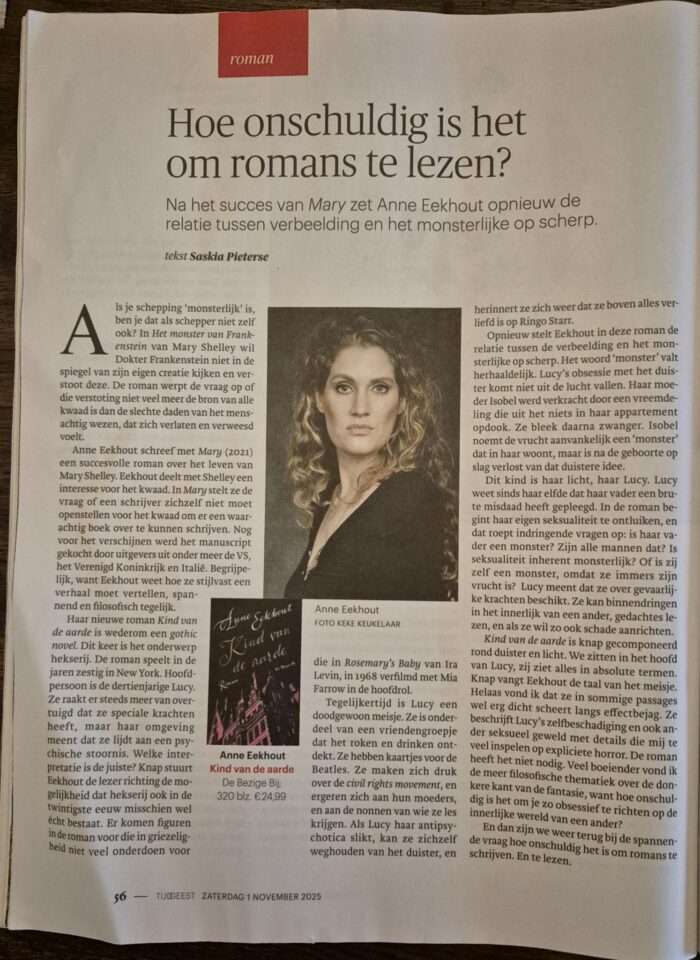 “Haar nieuwe roman Kind van de aarde is wederom een gothic novel. Dit keer is het onderwerp hekserij. De roman speelt in de jaren zestig in New York. Hoofdpersoon is de dertienjarige Lucy. Ze raakt er steeds meer van overtuigd dat ze speciale krachten heeft, maar haar omgeving meent dat ze lijdt aan een psychische stoornis. Welke interpretatie is de juiste? Knap stuurt Eekhout de lezer richting de mogelijkheid dat hekserij ook in de twintigste eeuw misschien wel écht bestaat. (…) Kind van de aarde is knap gecomponeerd rond duister en licht. We zitten in het hoofd van Lucy, zij ziet alles in absolute termen. Knap vangt Eekhout de taal van het meisje.”